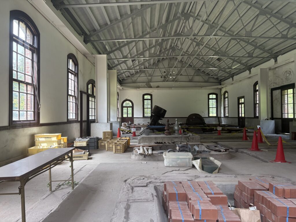 窓ガラス越しに中を撮影。工事現場みたいになっている。